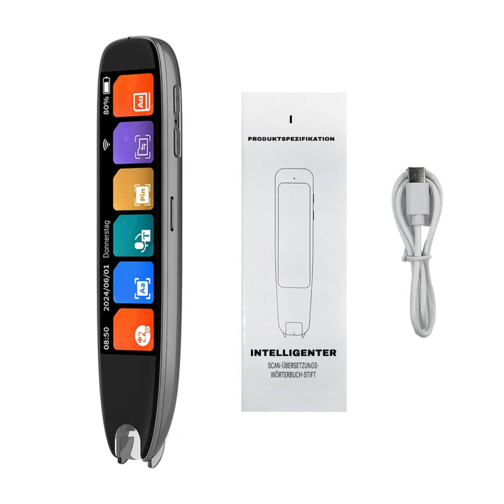 Der ScanPen ist ein intelligentes Gerät, das Fragen sofort beantwortet, in Echtzeit übersetzt und Text scannt. Er verfügt über einen großen HD-Bildschirm, WLAN, Offline-Übersetzung für über 60 Sprachen, eine integrierte Kamera, Bluetooth, Musikwiedergabe, Dateispeicher und Sprachaufzeichnung.